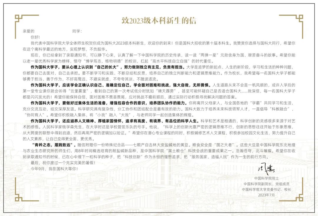 7月8日,中国科学院大学送出2023年首封本科生录取通知书。